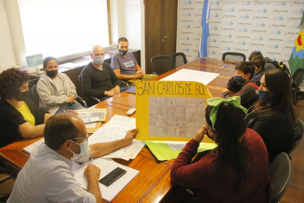El intendente municipal Marcos Pisano recibió esta tarde a un grupo de alumnos/as de la E.E.S N°2 para trabajar juntos el proyecto "Mi barrio, un lugar para todos", en el marco del cual se le impondrá al espacio verde del barrio Villa Diamante el nombre de Diego Armando Maradona.