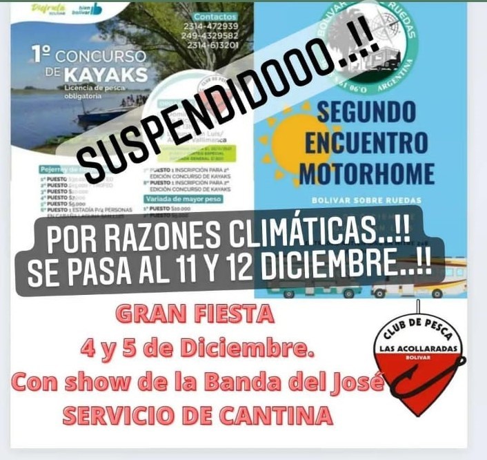 El Club de Pesca “Las Acollaradas” informa que, el evento organizado en la Laguna San Luis para este fin de semana, fue postergado para los días 11 y 12 de diciembre.
