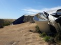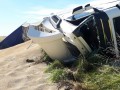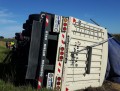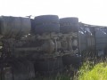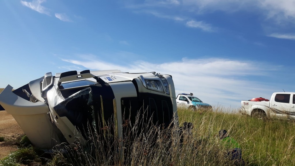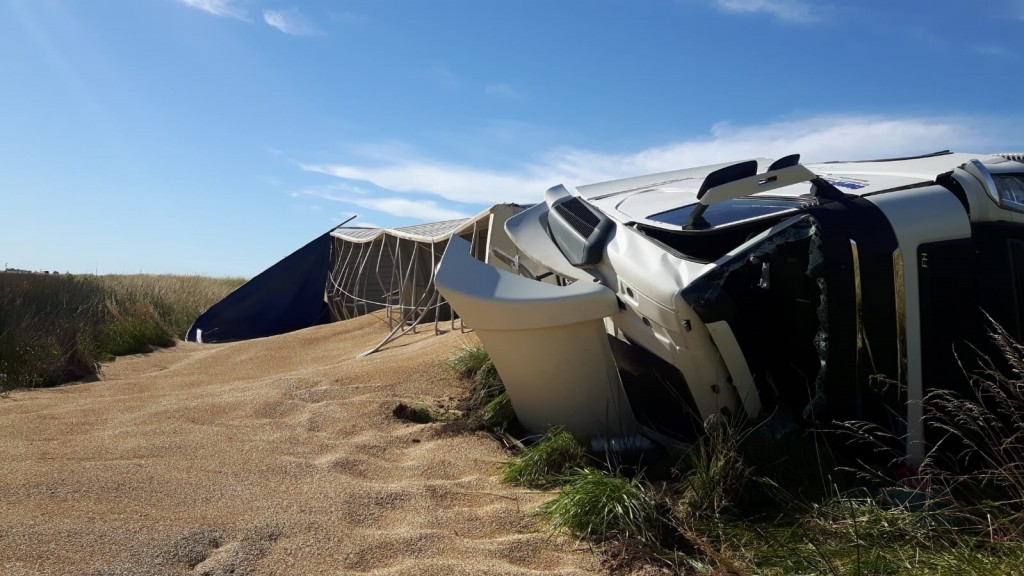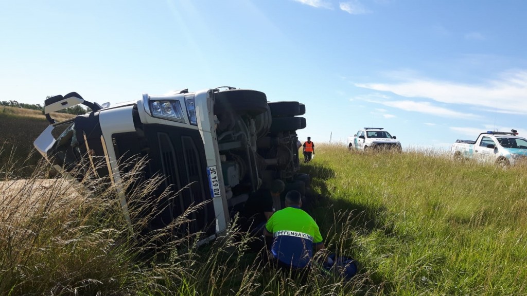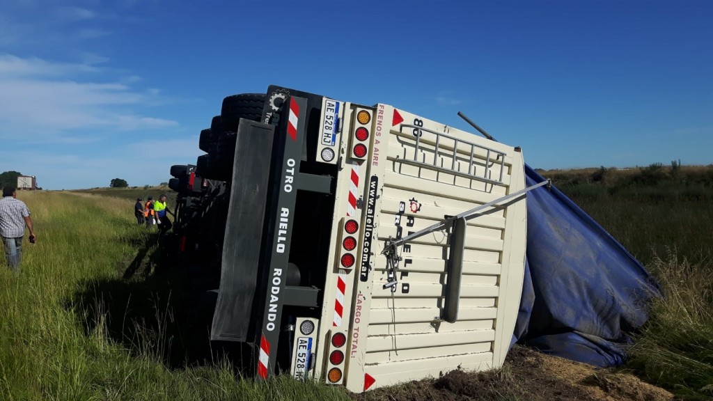Un camión Volvo 420, con dominio colocado AD614JF, que remolcaba una batea, con dominio AE528HJ terminó volcando en el préstamo de la ruta nacional 205, en inmediaciones a la bajada a Del Valle.