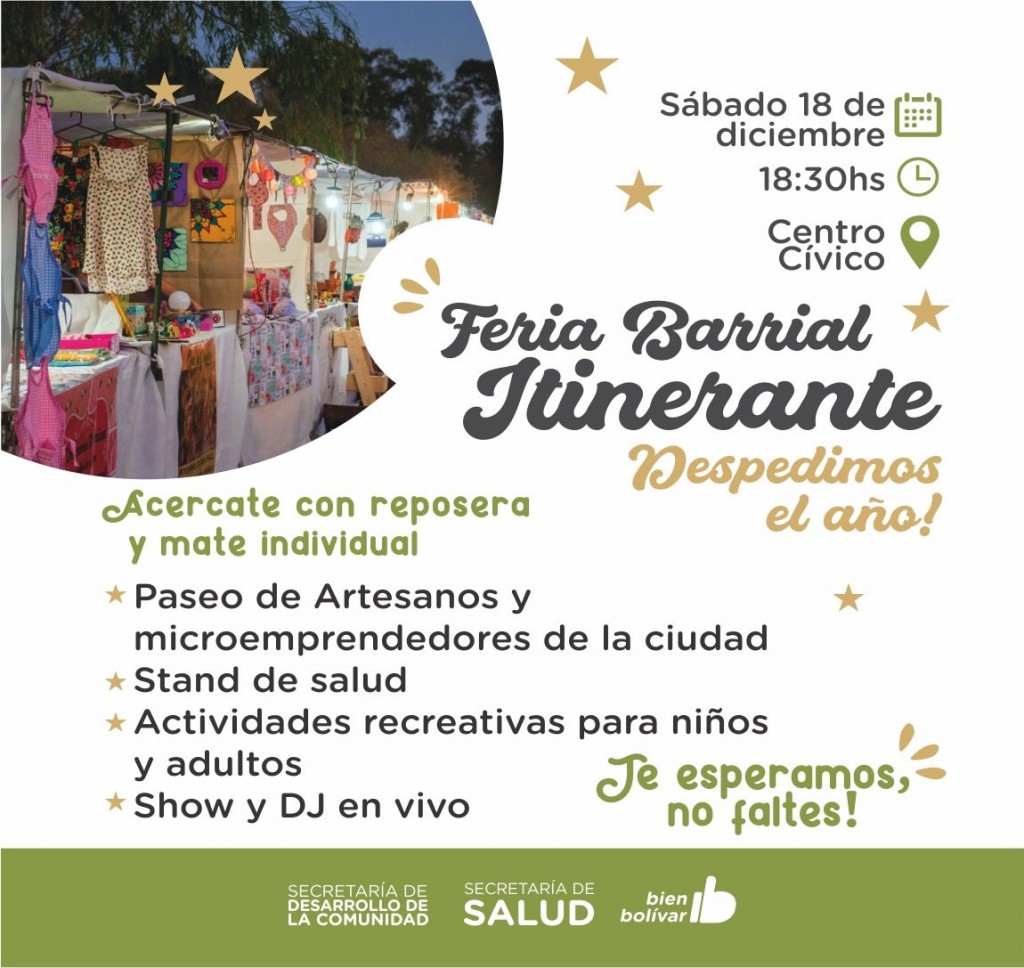 A partir de las 18.30hs, se emplazará para despedir el año un amplio paseo de artesanos y microemprendedores locales que ofrecerán sus productos al público, donde también habrá actividades recreativas para niños/as y adultos, y música.
