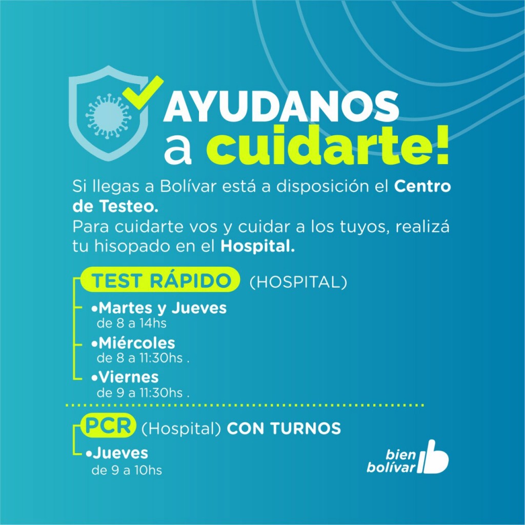 Se realizarán pruebas PCR con turno el día jueves de 9 a 10hs; mientras que las pruebas de Test Rápidos se podrán realizar martes y jueves de 8 a 14hs, miércoles de 8 a 11.30hs, y viernes de 9 a 11.30hs.