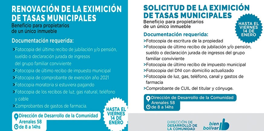 Es importante tener en cuenta que cualquiera de los dos trámites se puede realizar hasta el 14 de enero, de lunes a viernes de 8 a 14hs, en la Dirección de Desarrollo de la Comunidad, ubicada en Arenales 58.