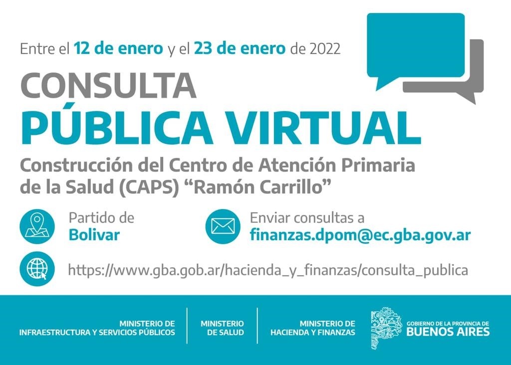 A partir del 12 y hasta el 23 de enero, se llevará a cabo una Consulta Pública Virtual para la construcción de un nuevo Centro de Atención Primaría de la Salud (CAPS) en el Partido de Bolívar, que se llamará "Ramón Carrillo".