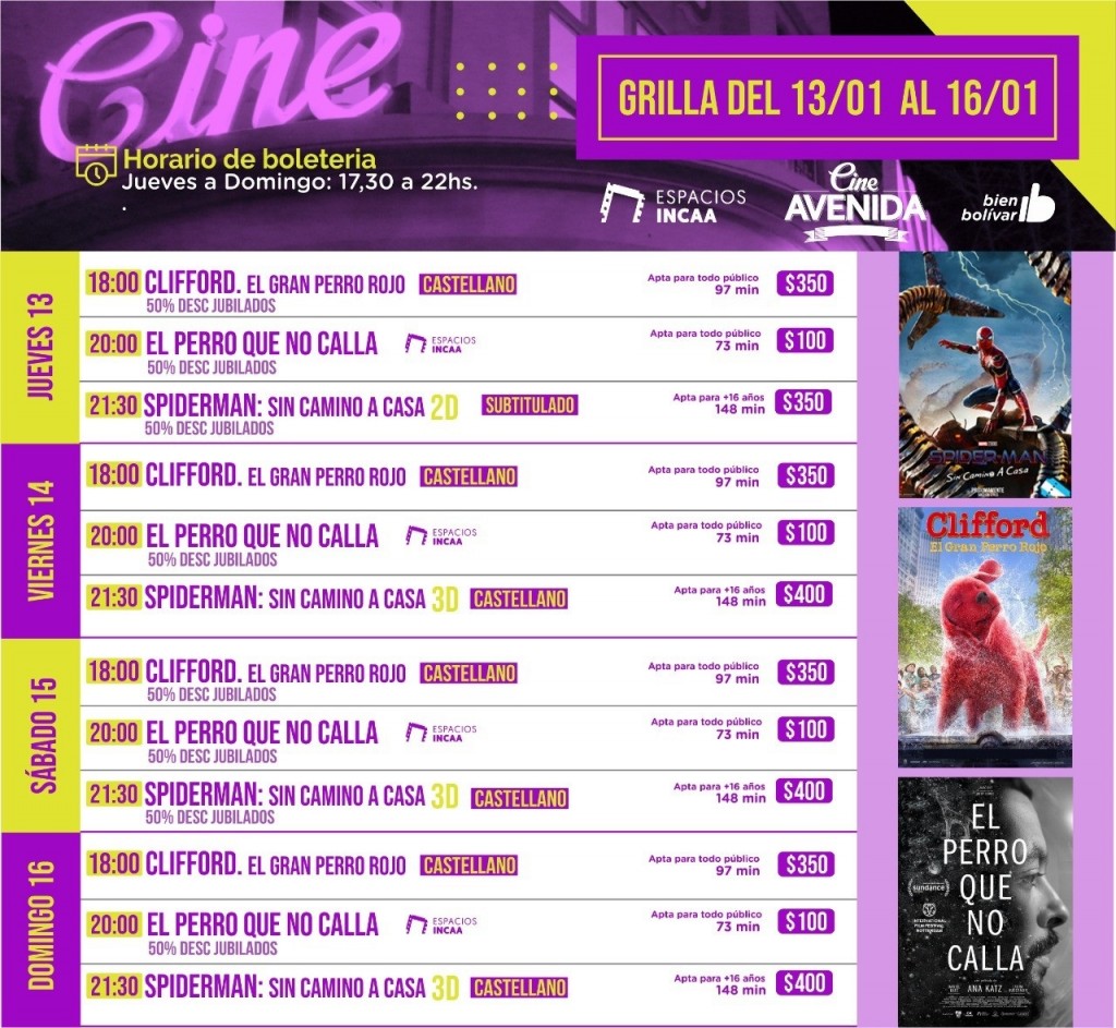 El Cine Avenida propone una cartelera variada para este fin de semana con “Clifford. El Gran Perro Rojo” y “El Perro Que No Calla” la propuesta de Espacio INCAA.  Además, continúa en cartelera el reestreno de “Spider-Man: No Way Home”.