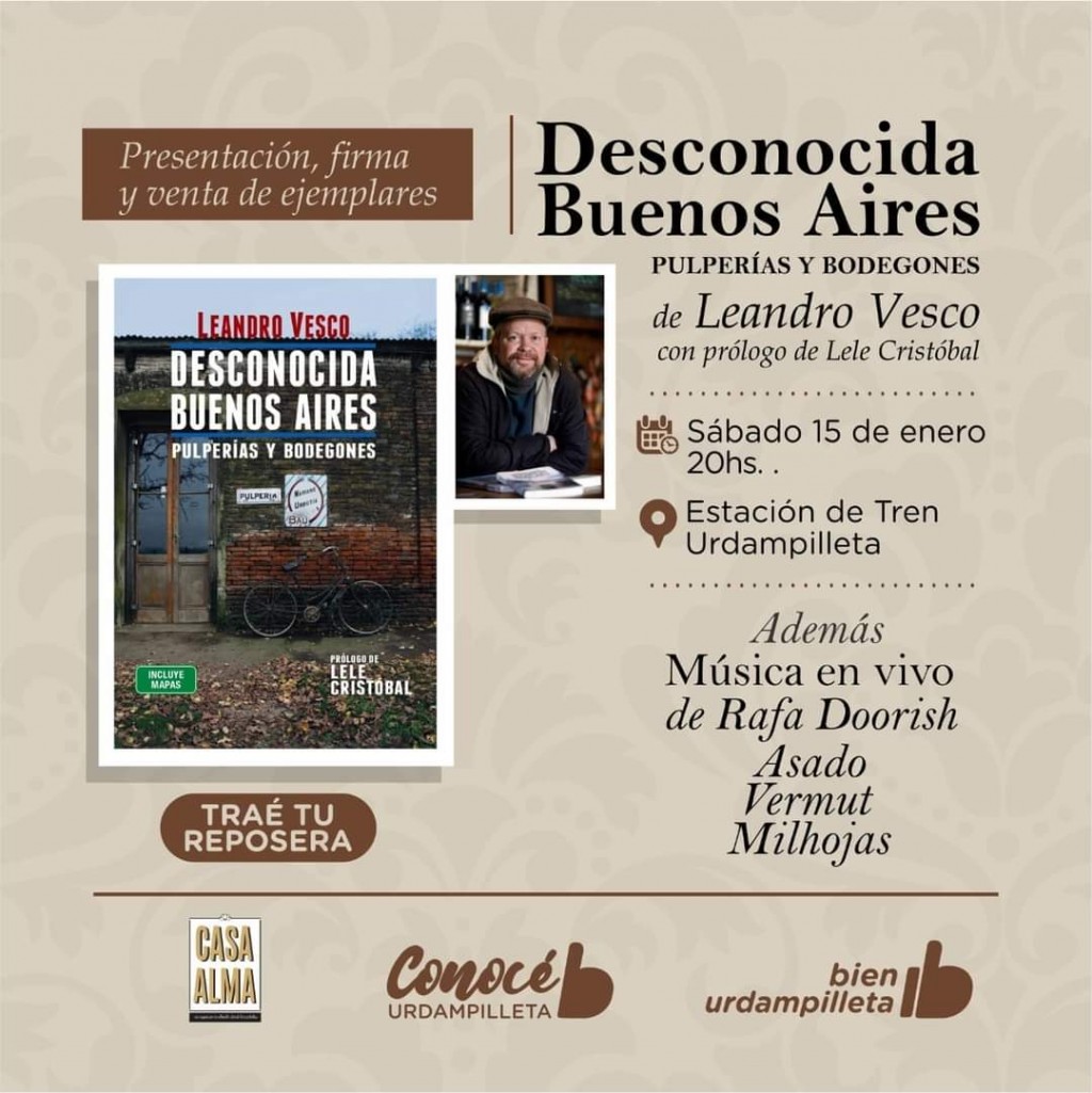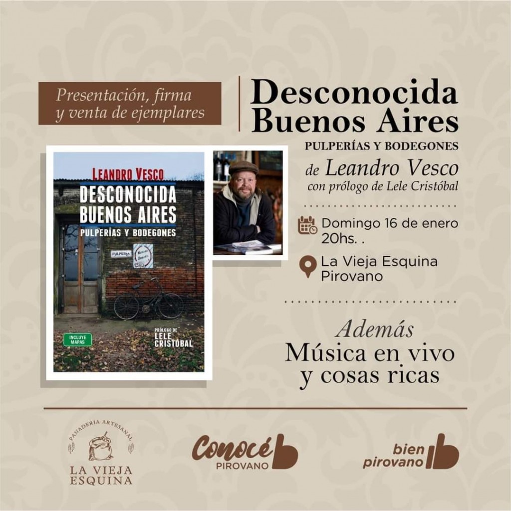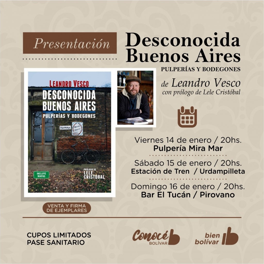 ESTE VIERNES    LA MUNICIPALIDAD ACOMPAÑA LA PRESENTACIÓN DEL LIBRO "DESCONOCIDA BUENOS AIRES” DE LEANDRO VESCO   Este viernes, a las 20hs en la Pulpería Mira Mar, el escritor Leandro Vesco presentará su libro "Desconocida Buenos Aires. Pulperías y Bodegones”, y desde la Dirección de Turismo el Municipio acompaña la iniciativa cultural.    Esta mañana, el director de Turismo Emilio Leonetti junto a Vesco, brindaron detalles del evento que tendrá lugar en la famosa pulpería.    "Estamos muy contentos de recibir a Leandro, este libro que tiene en la tapa a la Pulpería Mira Mar, y donde hay historias de Urdampilleta y Pirovano también, es muy positivo para Bolívar y el turismo rural", destacó Leonetti.    Por su parte, Vesco sostuvo: " Presentar el cuarto libro de la saga en este lugar y junto a sus protagonistas, responde a una metodología de trabajo que sostengo, la de volver al lugar donde me confiaron historias".   Además, a las 21.30hs luego de la presentación, quienes asistan al evento podrán disfrutar de una cena en el lugar por un valor de $1.500 la tarjeta.    Los cupos son limitados y se solicitará pase sanitario para participar, las reservas se pueden hacer a los teléfonos 2314-624039 o 620031.    En tanto, el sábado a las 20hs Vesco presentará el libro en la Estación de Tren de Urdampilleta; y el domingo 16 en el Bar El Tucán de la localidad de Pirovano.