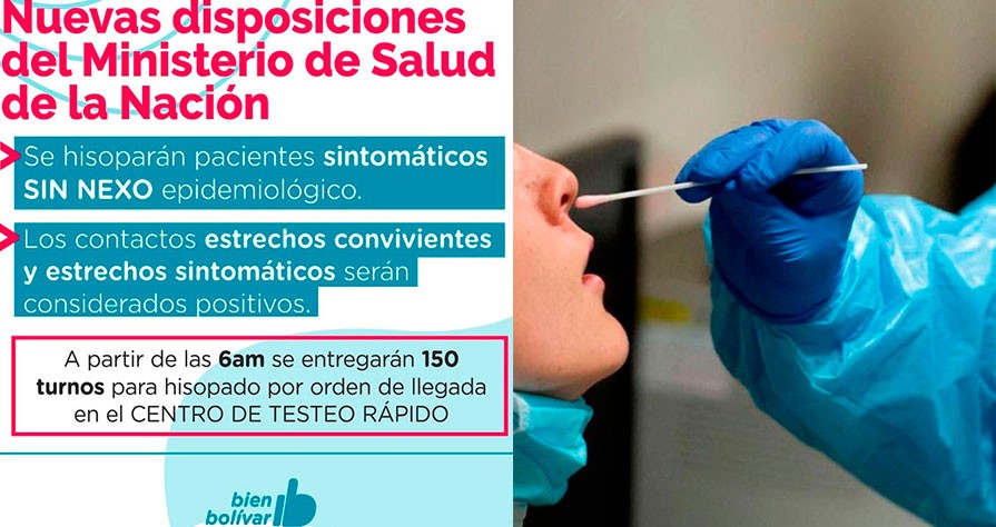 Teniendo en cuenta las nuevas disposiciones del Ministerio de Salud de la Nación y Región Sanitaria, se hisoparán sólo pacientes sintomáticos sin nexo epidemiológico. -