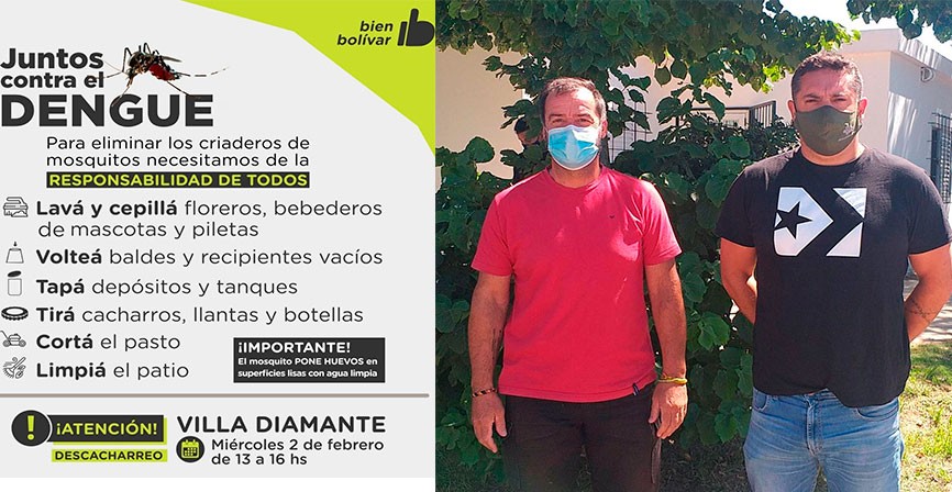 PREVENIR ES SALUD   LA MUNICIPALIDAD REALIZA TAREAS DE PREVENCIÓN CONTRA EL DENGUE lura El director de Calidad de Alimentos y Zoonosis, Enzo Solondoeta, y desde el área de  Espacios Públicos, Arturo Martín, brindaron detalles del trabajo de descacharreo, recolección y pulverización que se realiza desde el Municipio en todo el Partido de Bolívar.    Para prevenir es fundamental el accionar responsable de los/as vecinos/as, ya que es importante controlar que no haya insectos intradomiciliarios: "Estos días de lluvia fortalecieron el crecimiento de los mosquitos, por eso programamos un descacharrado por barrio. Es fundamental ordenarnos para sacar la basura, mantener el pasto corto en nuestros hogares y cuidar el agua de las piletas. Vamos a trabajar en la calle, pero es importante que nos acompañen los vecinos", sostuvo Enzo Solondoeta. luro Desde el área de Desarrollo Social a cargo de Alexis Pasos, agentes comunitarios se suman a la campaña de manera territorial, informando y concientizando a la población, para que pueda realizar la limpieza de forma correcta.    Este martes, los agentes recorrerán Villa Diamante, y el miércoles 2 de 13 a 16hs se recolectará el descacharreo correspondiente: "Es importante eliminar todo aquello que acumule agua y no utilicemos para que no crezca el mosquito", explicó Solondoeta.    En cuanto a la pulverización, Arturo Martín informó: "Se realiza todos los días en dos turnos, a la mañana de 6a 9hs y por la tarde de 18 a 23hs. No es nocivo para las personas ni para los animales".   Además, se solicita el compromiso de toda la población para lograr un Bolívar sin mosquitos, entre las medidas de prevención se recomienda: Lavar y cepillar floreros, bebederos de mascotas y piletas; voltear baldes y recipientes vacíos; tapar depósitos y tanques; tirar cacharros, llantas y botellas; y limpiar el patio y terrenos baldíos.
