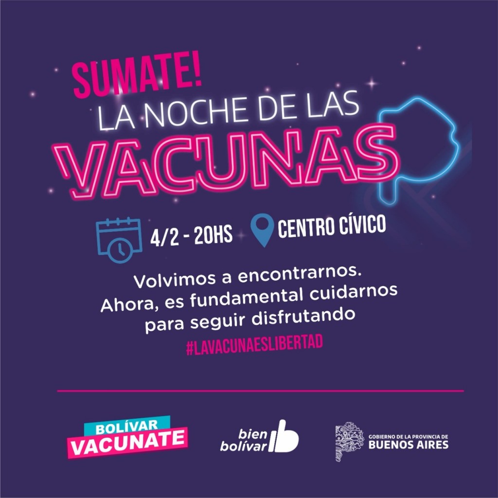 Bolívar se suma a "La Noche de las Vacunas" una iniciativa que lanzó el Gobierno de la provincia de Buenos Aires, a partir de la cual de manera voluntaria los/as interesados/as se podrán aplicar primeras, segundas dosis y refuerzos. -