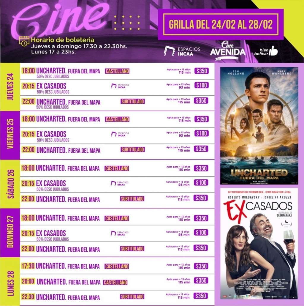 El Cine Avenida propone una cartelera variada para este fin de semana con el estreno de “UNCHARTED: Fuera Del Mapa” y “Ex Casados” una propuesta de Espacio INCAA.