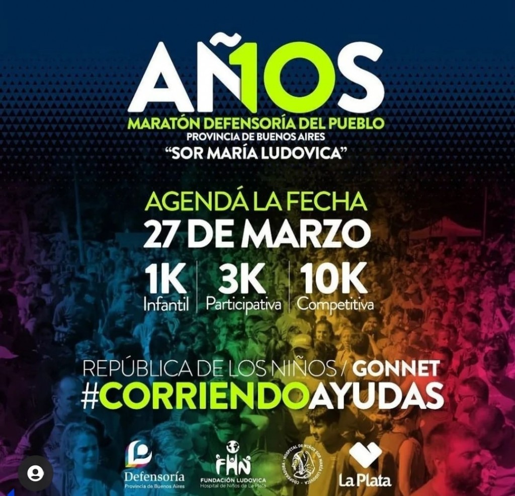 El evento promovido por la Defensoría, que conduce Guido Lorenzino, organiza junto a la Municipalidad de La Plata, la Fundación Ludovica y la Cooperadora del Hospital de Niños, contará con competencias de 10K, 3K y 1K infantil, y las inscripciones ya pueden realizarse online hasta el 23 de marzo inclusive en https://sportick.com.ar/w/events/