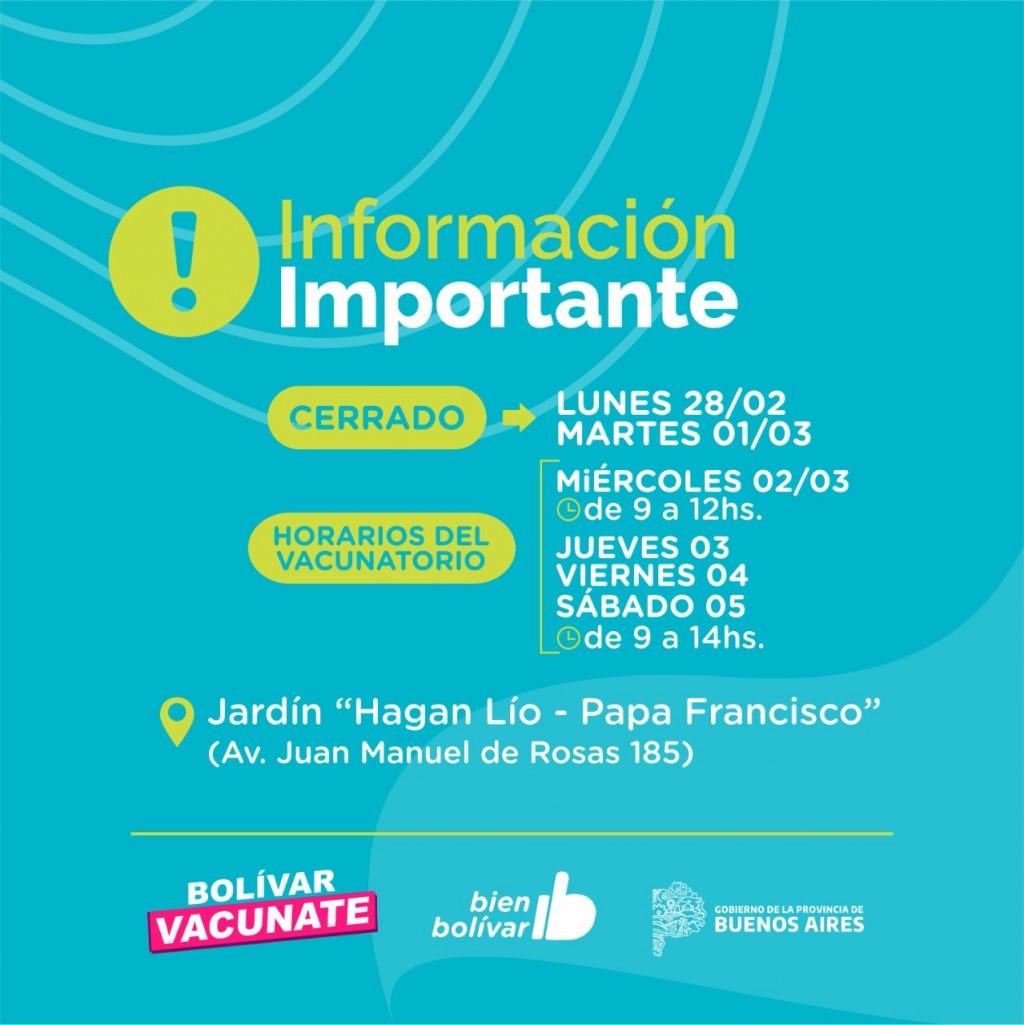 Por su parte, el Centro Vacunatorio funcionará el miércoles 2 de marzo de 9 a 12hs, y desde el jueves 3 al sábado 5 de 9 a 14hs, en Av. Juan Manuel de Rosas 185.
