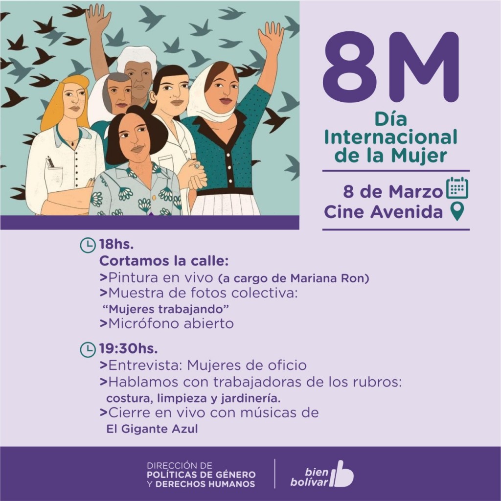 Este año, tendrá lugar en Bolívar una jornada reflexiva desde las 18hs sobre la Av. San Martín, donde se encuentra en el Cine Avenida. Comenzará con una intervención artística a cargo de Mariana Ron, también habrá una muestra de fotos colectiva sobre mujeres trabajando, y estará el micrófono abierto para quienes quieran pronunciarse con respecto a esta temática. Además, se llevará a cabo un taller interactivo sobre los derechos económicos de las mujeres, a cargo del equipo del Hogar de Protección Integral.