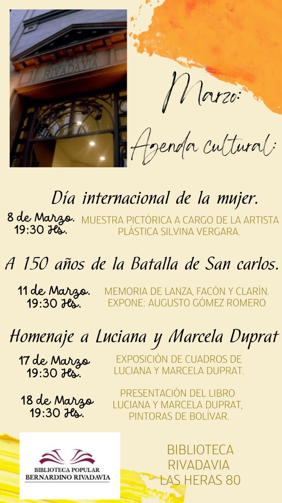 La Biblioteca Rivadavia, presentó las actividades culturales que se desarrollarán durante el mes de marzo, con eje principal en el Día Internacional de la Mujer y el aniversario 150 de la Batalla de San Carlos. La misma fue encabezada por Julio Fal, Griselda Iglesias y Facundo Gómez Romero.