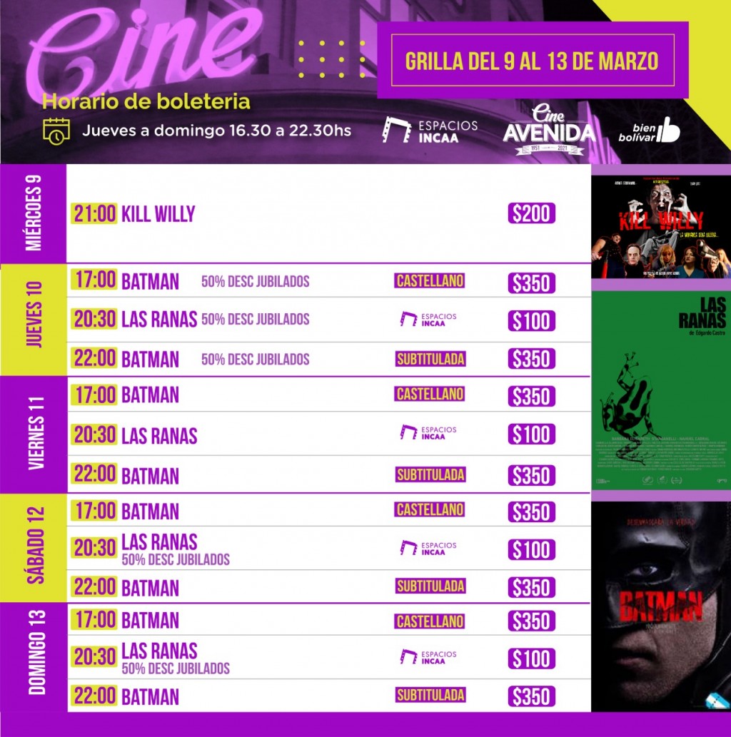 El Cine Avenida propone una cartelera variada para este fin de semana con el estreno de “Batman”, la película Kill Willy, y el film “Las Ranas” una propuesta de Espacio INCAA.