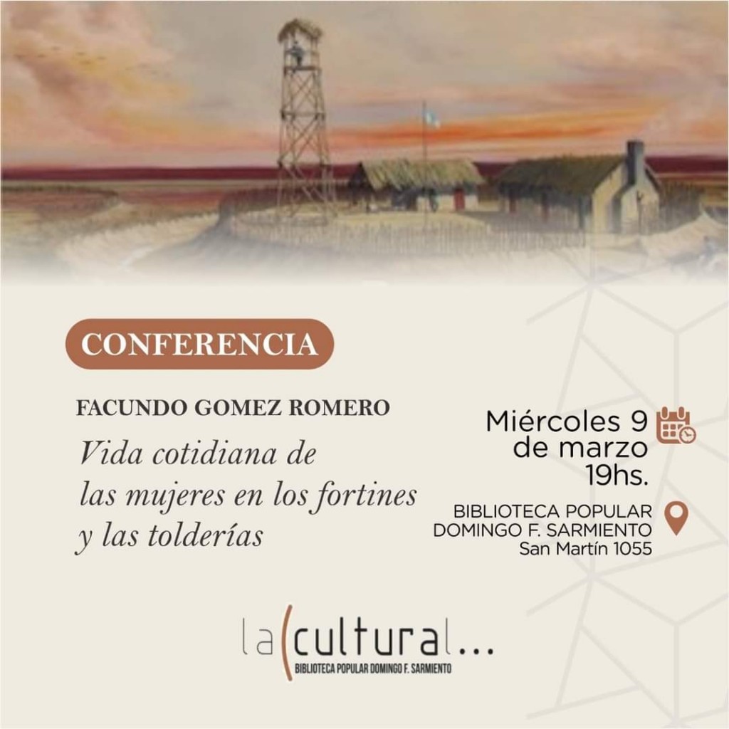 El día 9 de marzo a las 19 hs, en las instalaciones de la Asociación Cultural y Biblioteca Popular Domingo Faustino Sarmiento, en San Martín 1065, Facundo Gómez Romero brindará una charla sobre la vida cotidiana de las mujeres en los fortines y las tolderías, enel marco del 150º aniversario de la batalla de San Carlos.