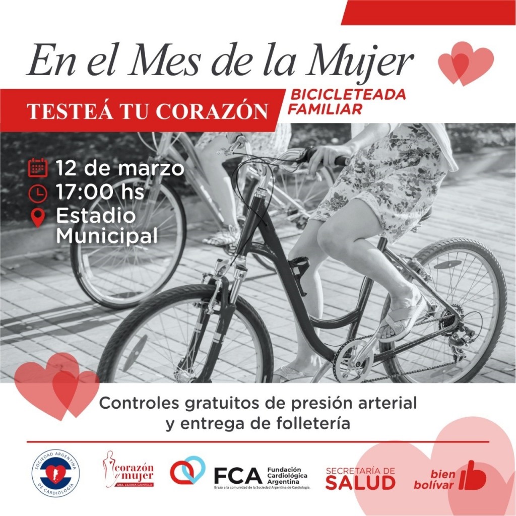 En el marco del Mes de la Mujer, este sábado 12 a las 17 horas en el Estadio Municipal, tendrá lugar una “Bicicleteada Familiar”, y desde el Municipio se invita a toda la comunidad a participar del encuentro recreativo para reflexionar acerca de la importancia de cuidar el corazón.  "Queremos poner en agenda que las mujeres debemos realizarnos anualmente controles cardiológicos. Este evento es para concientizar, invitamos a toda la comunidad a que se sumen a la vuelta por Bolívar en familia", sostuvo Jofré.