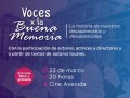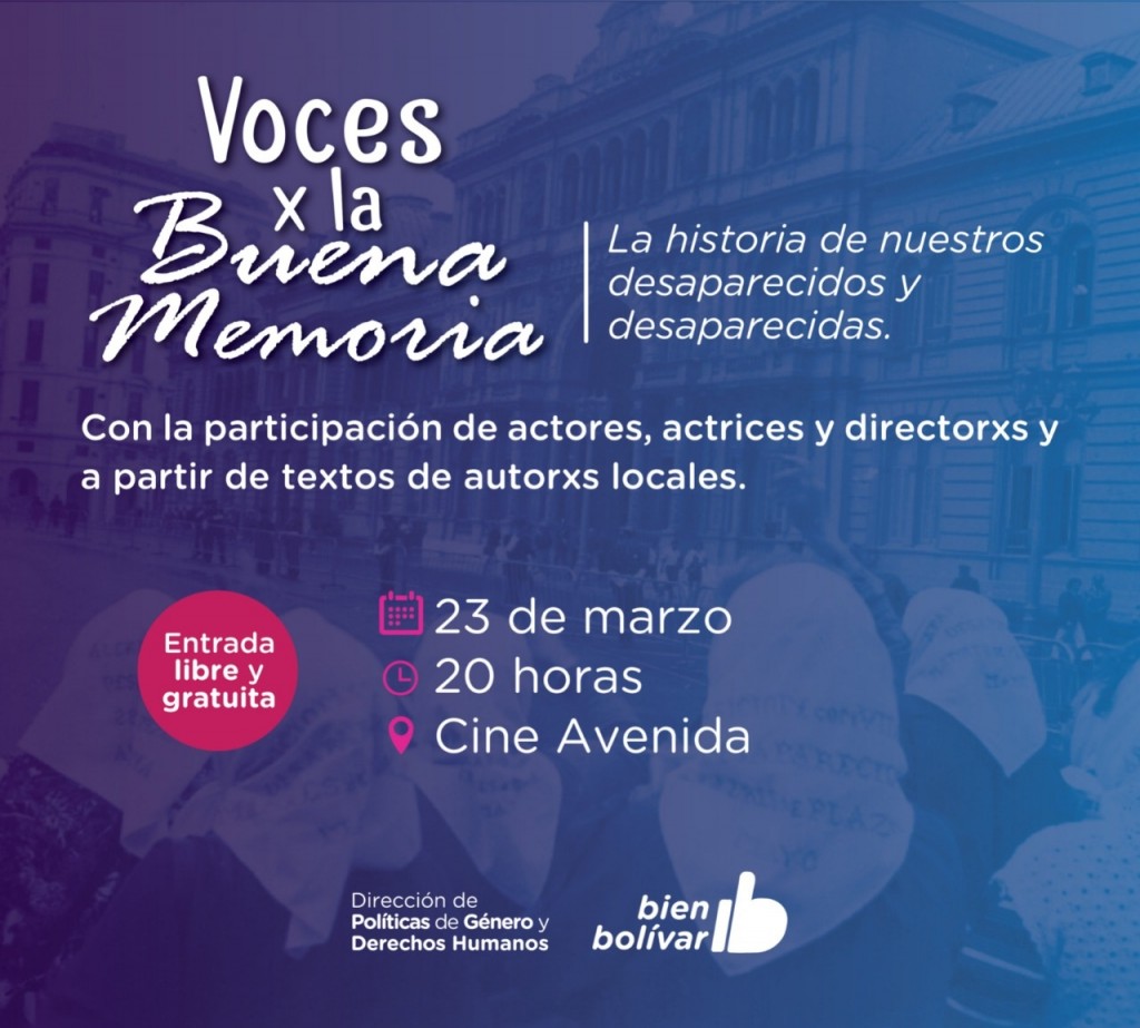 El miércoles 23 de marzo, en el marco de la conmemoración del Día Nacional de la Memoria por la Verdad y la Justicia, la dirección de Políticas de Género y Derechos Humanos invita a la propuesta Voces x la Buena Memoria en el Cine Avenida.