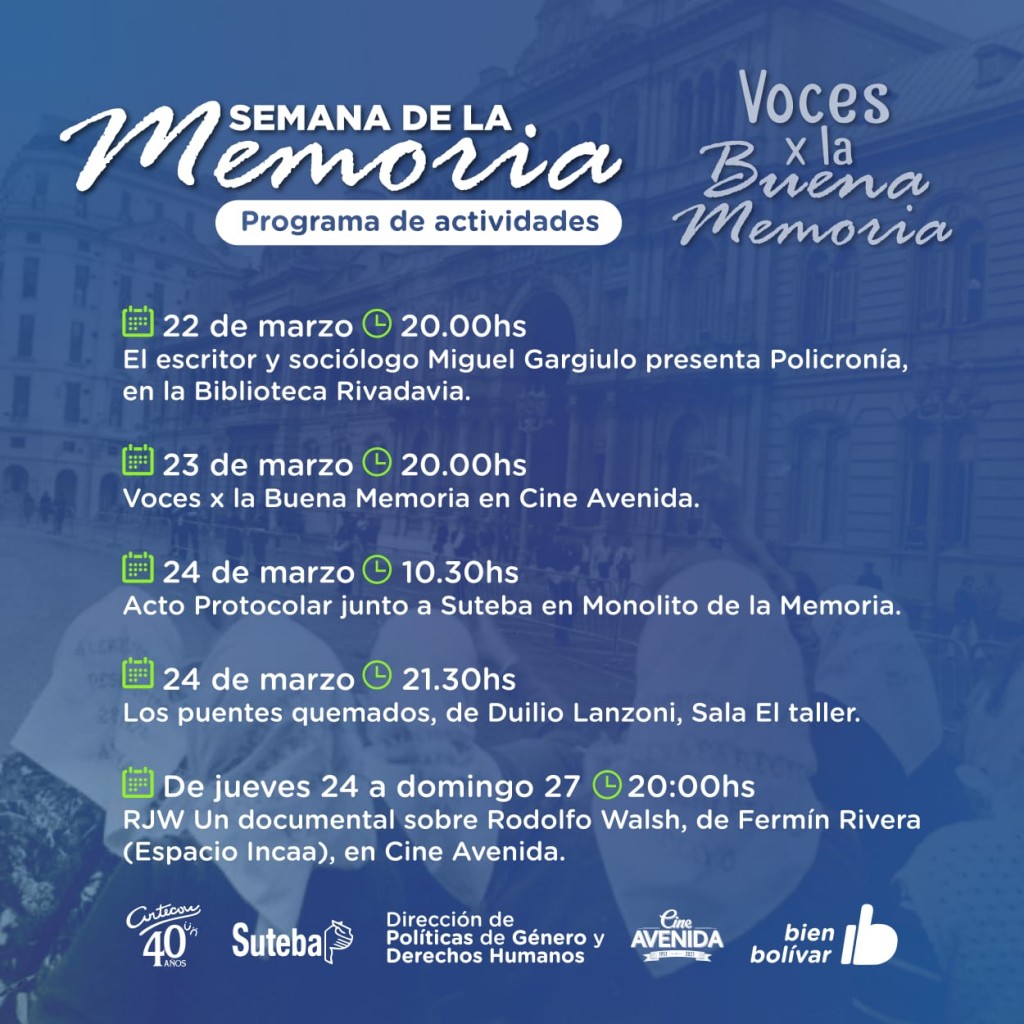 En tanto, a las 20 horas en el Cine Avenida se llevará a cabo la propuesta artística colectiva “Voces x la buena memoria”. “Queremos invitar a toda la comunidad, vamos a estar presentando micromonólogos y otras producciones artísticas que se basan en textos que escribieron bolivarenses en una convocatoria del 2019 sobre la historia de los y las bolivarenses”, expresó y agregó que “será una propuesta desde lo artístico muy interesante y colectiva”.