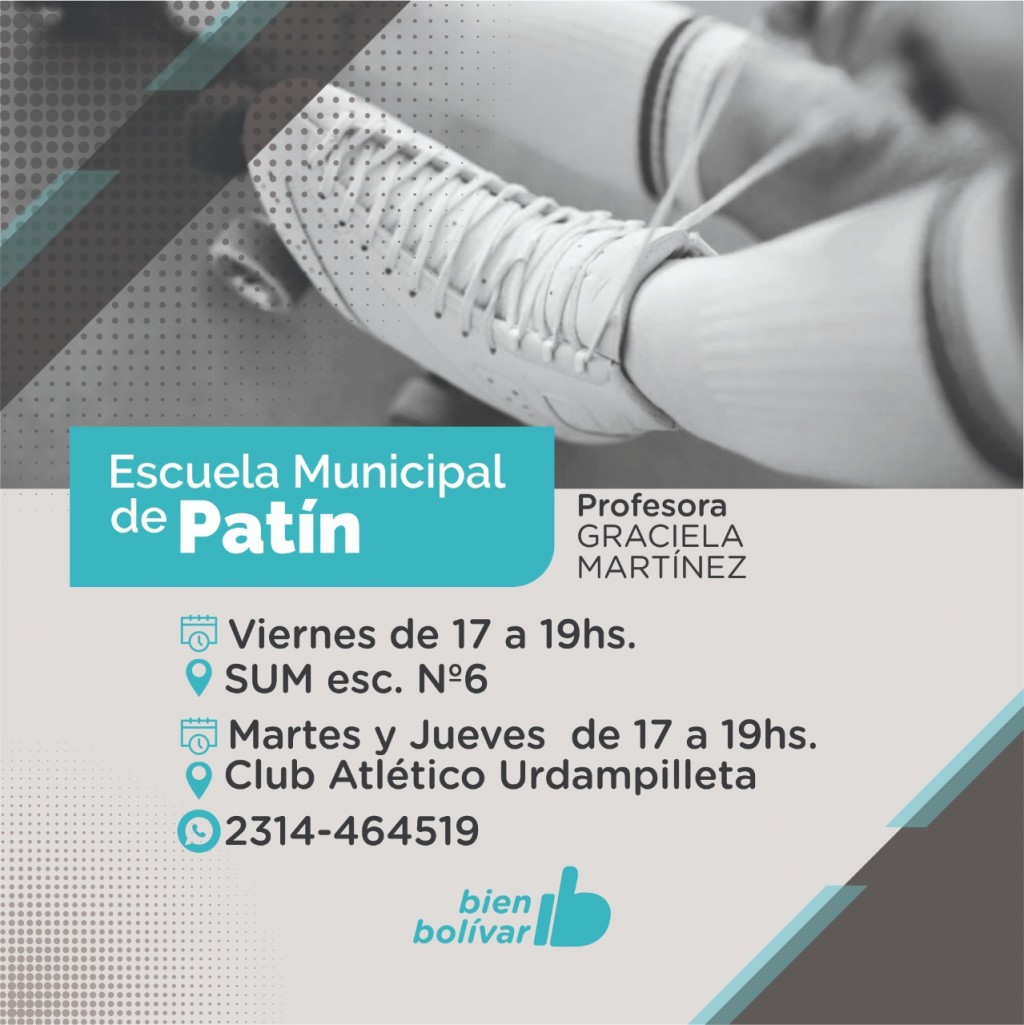 La Escuela Municipal de Patín, a cargo de la profesora Graciela Martínez, funciona en el SUM de la Escuela n°6 los viernes de 17 a 19hs; mientras que en Urdampilleta las clases son los martes y jueves de 17 a 19hs, en el Club Atlético Urdampilleta. El teléfono para comunicarse por consultas es el 2314-464519.
