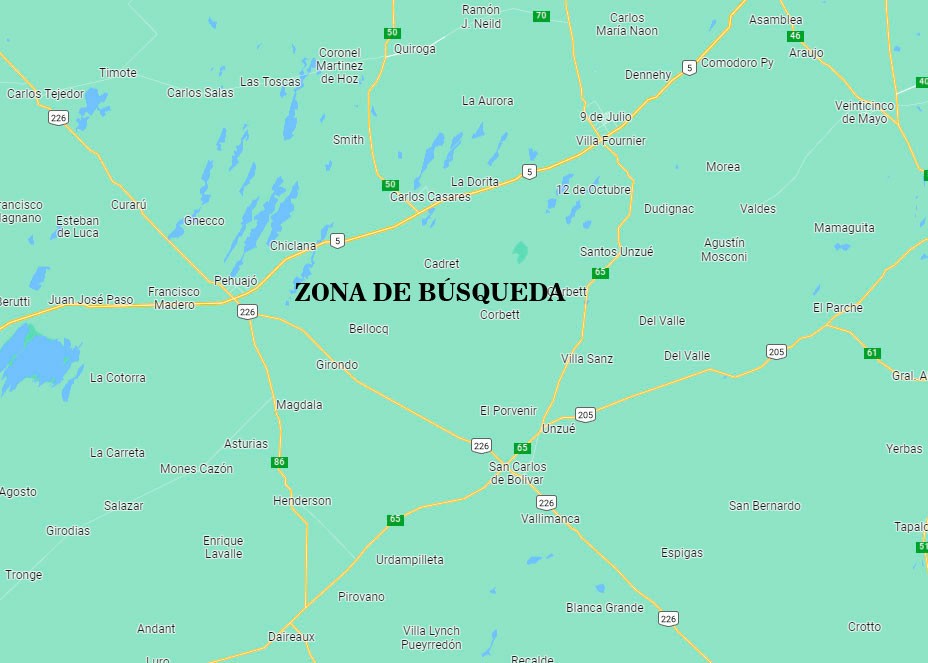 Este lugar dista a 41 kilómetros a campo traviesa de la Cabaña El Rincón, y circulando por los caminos rurales, a 65. Parte del dispositivo de rastrillaje debio trasladarse hasta la intersección de rutas 5 y 50 en horas de la mañana, visiblemente complicado por las lluvias que se están dando en la zona centro de la provincia de Buenos Aires.-