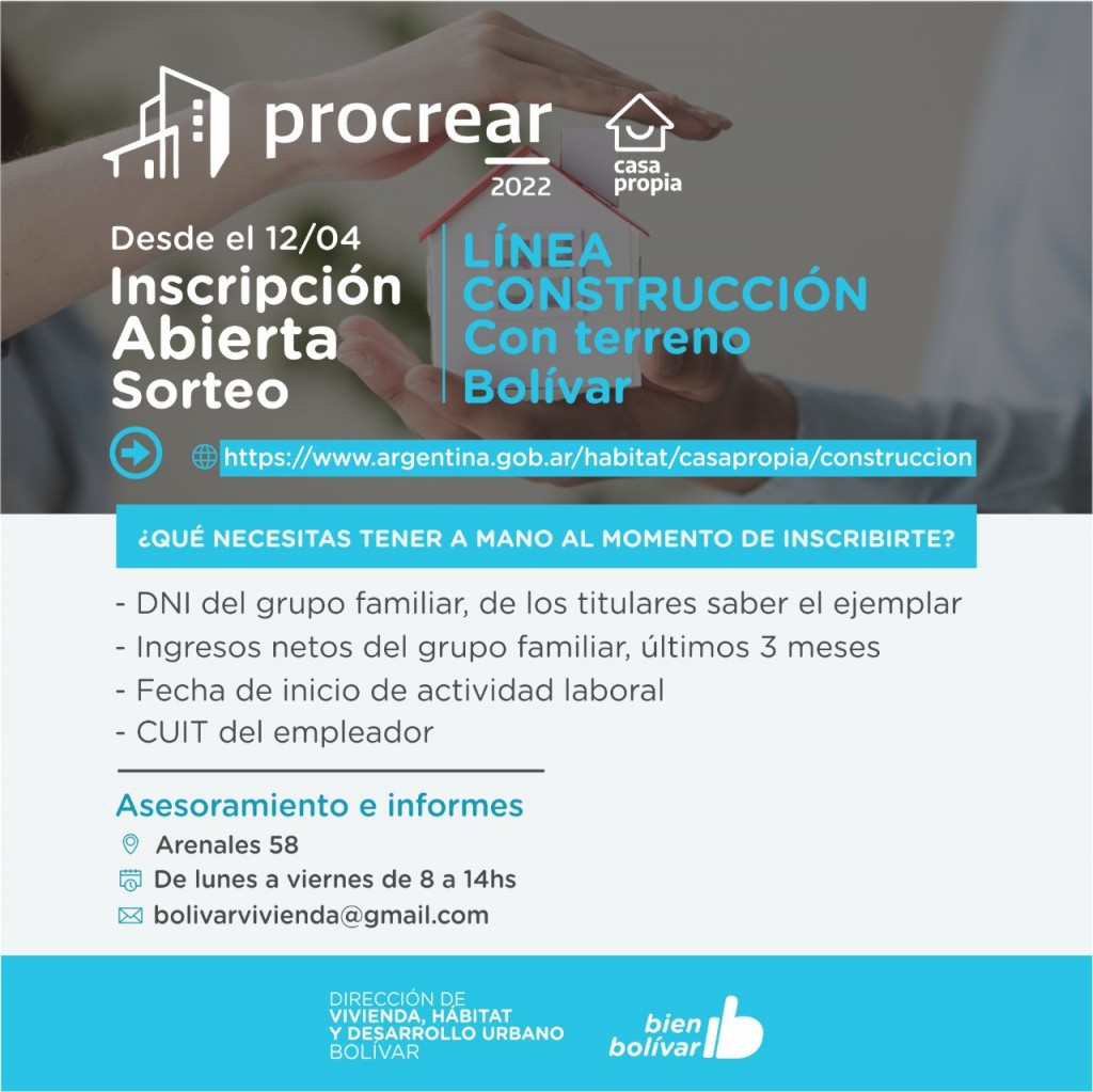 La Dirección de Vivienda, Hábitat y Desarrollo Urbano de la Municipalidad de Bolívar ofrece asesoramiento para realizar la inscripción al programa. Los interesados/as pueden acercarse de lunes a viernes de 8 a 14hs a la oficina del área municipal, ubicada en Arenales 58, o contactarse a través del correo electrónico bolivarvivienda@gmail.com.