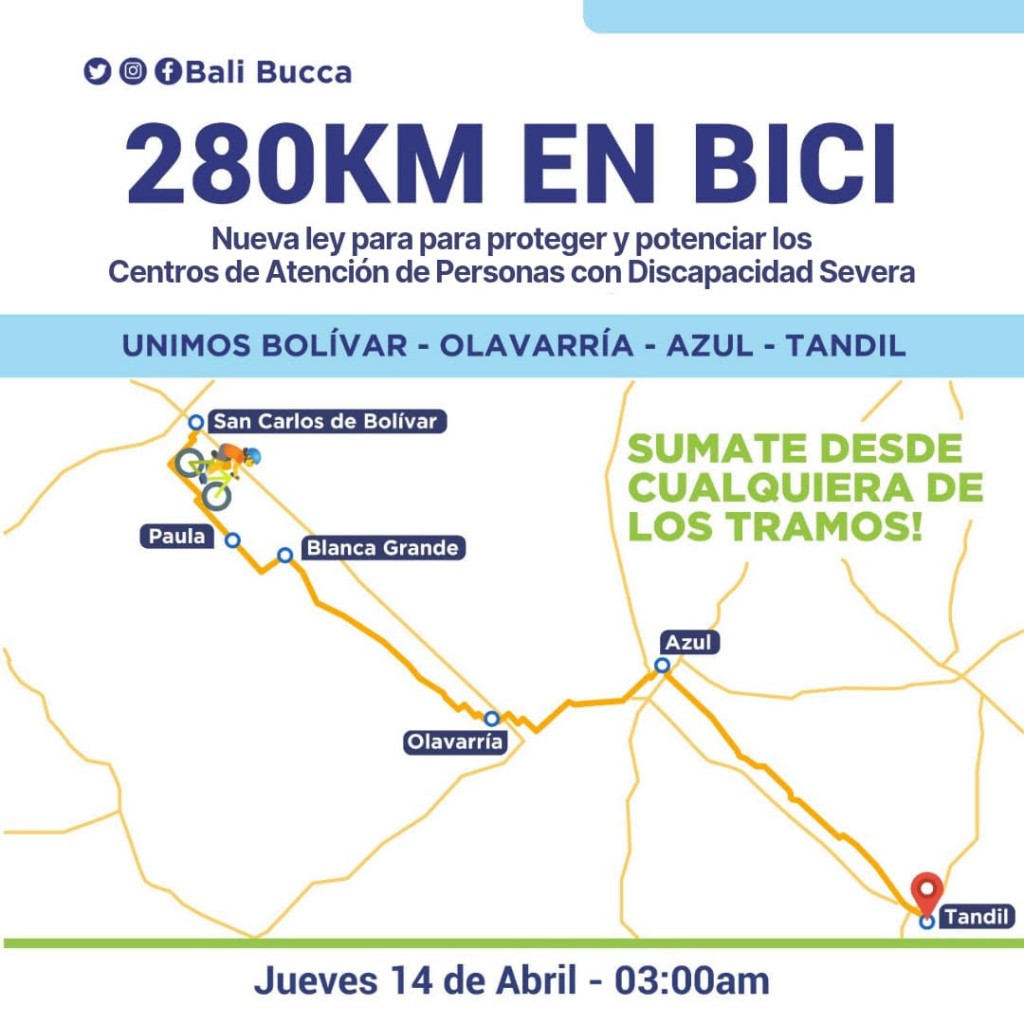 En este sentido hará 280 kilómetros en bici, partiendo el jueves 03:00 desde Bolívar, pasando por Paula, Blanca Grande, Olavarría, Azul y finalmente hasta llegar a Tandil.