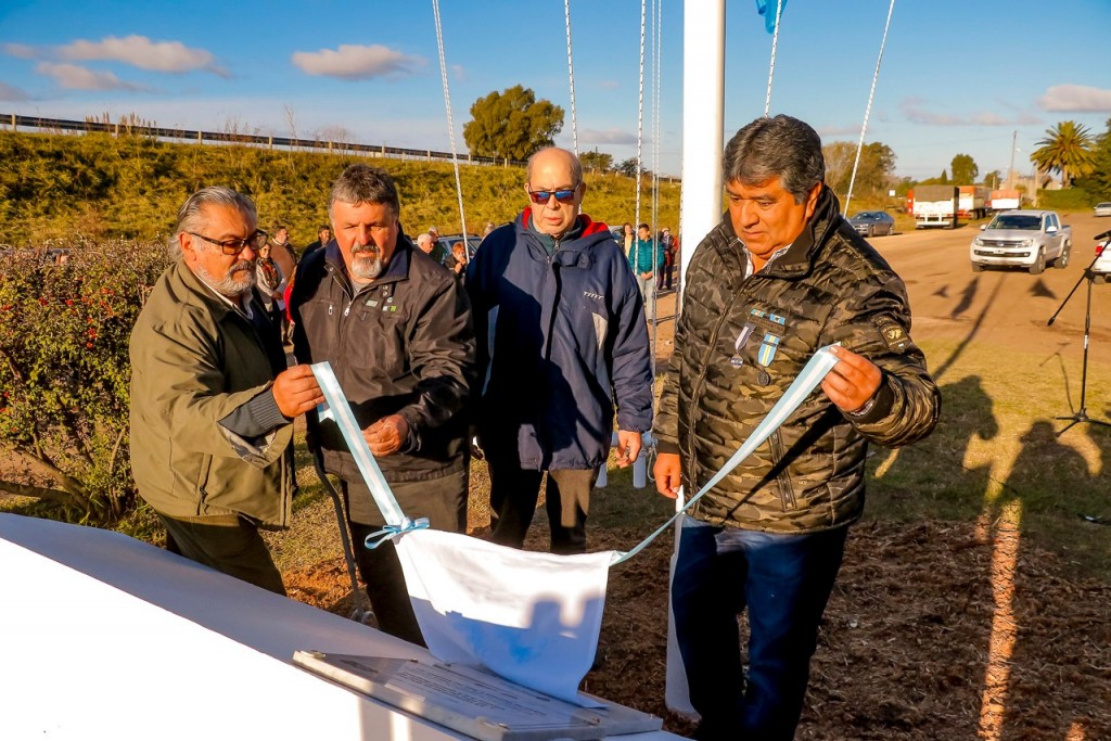 Las estrofas del Himno Nacional fueron entonadas por el Veterano de la localidad de Carhué, Delmo Horacio Díaz, y el director del Archivo Histórico Municipal Santos Vega junto a los Veteranos descubrieron una placa conmemorativa.