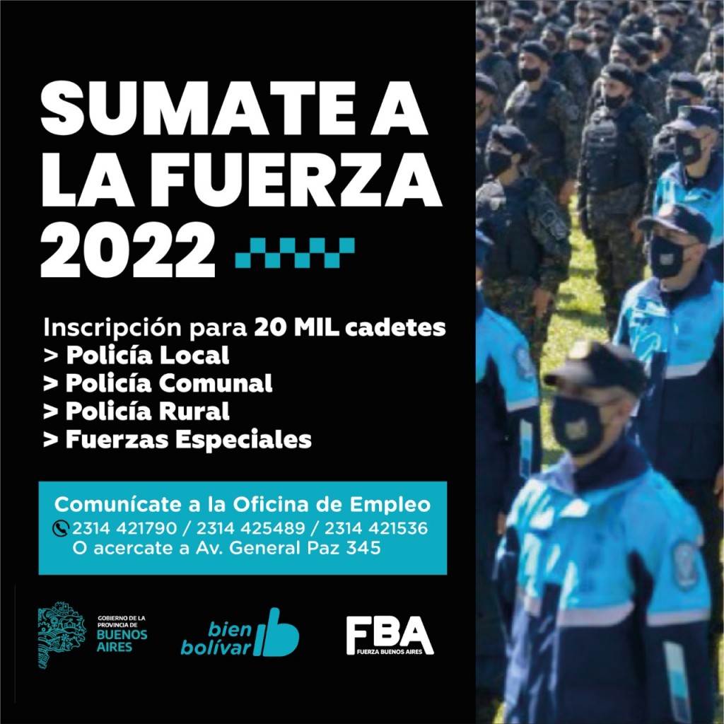 Para más información acerca del ingreso 2022, los/as interesados/as se pueden inscribir en el siguiente link: www.mseg.gba.gov.ar , o de forma presencial acercarse a la Dirección de Empleo ubicada en Av. General Paz 345, o comunicarse a los teléfonos 2314-421730; 2314-425489; 2314-421536.