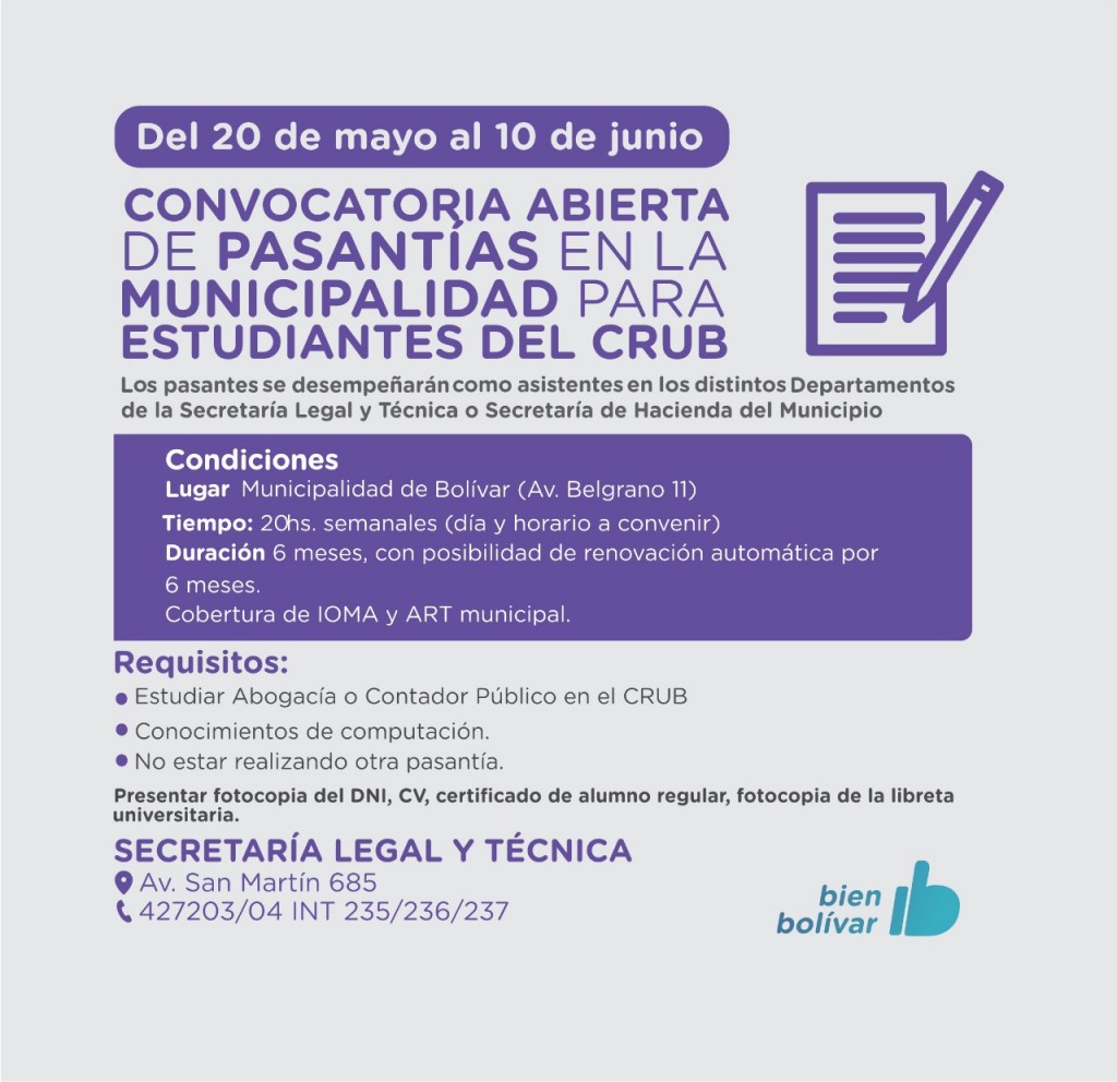 Desde la Secretaría de Legal y Técnica y la Secretaría de Hacienda de la Municipalidad se informa que se encuentra abierta desde el 20 hasta el 10 de junio la inscripción para realizar pasantías en el Municipio.