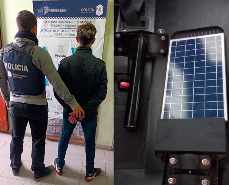 El personal policial se acercó rápidamente al lugar y constató la presencia de un hombre mayor de edad domiciliado en Bolívar, quien instantes previos había sustraído una pantalla solar con luces Led marca Werke, la que ante la presencia policial intentó sin éxito ocultar a escasos metros de la finca. Los policías de acuerdo a las facultades legales procedieron a su inmediata aprehensión del joven y a su posterior traslado a la comisaría local donde quedó alojado.