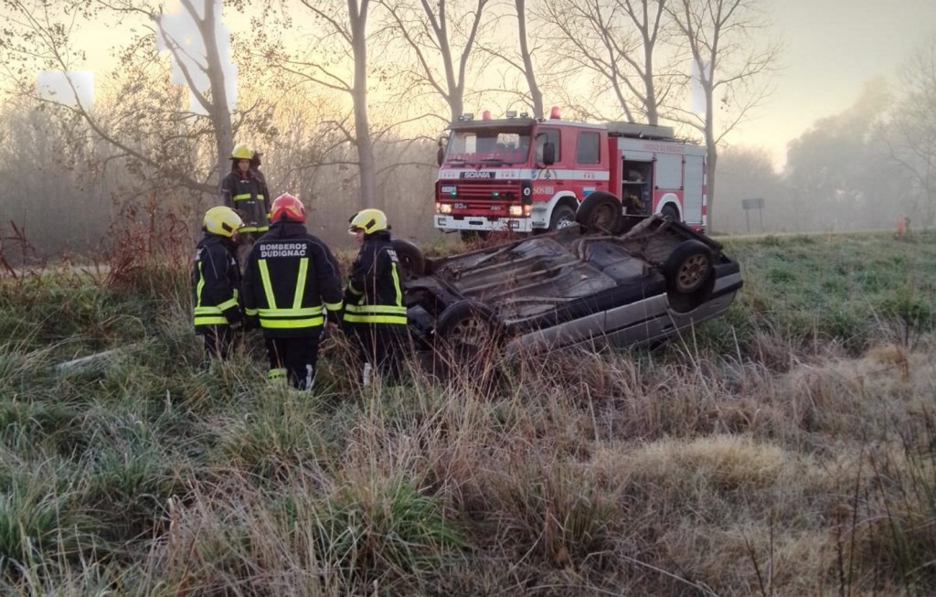 Se registró el vuelco de un automóvil en el acceso a la localidad de Dudignac a pocos metros de Ruta 65, se presume que ante la presencia de niebla podría ser una de las causas del accidente en cuestión.