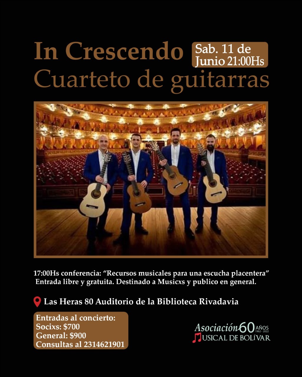 El mismo estará a cargo del cuarteto de Guitarras In Crescendo y será el próximo sábado 11 de junio a las 21:00 Hs en el auditorio de la Biblioteca Bernardino Rivadavia ubicado en Las Heras 80.