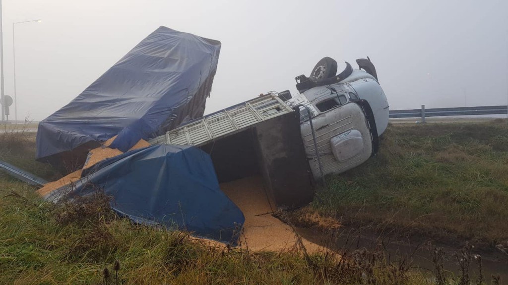 La baja visibilidad generó que un camión con acoplado que transportaba cereal termine volcando. Afortunadamente el conductor no resultó con heridas aunque fue asistido por una ambulancia.