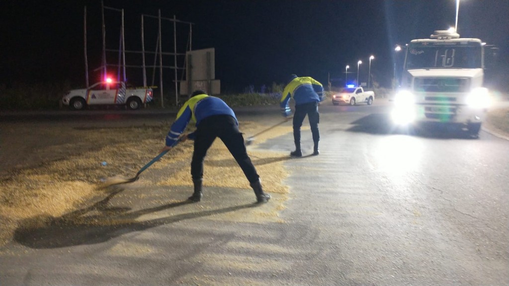 Ante el riesgo que esto significa para el tránsito intenso que confluyen en ambas rutas, Defensa Civil y Bomberos Voluntarios trabajaron en la limpieza del lugar, en forma preventiva..-
