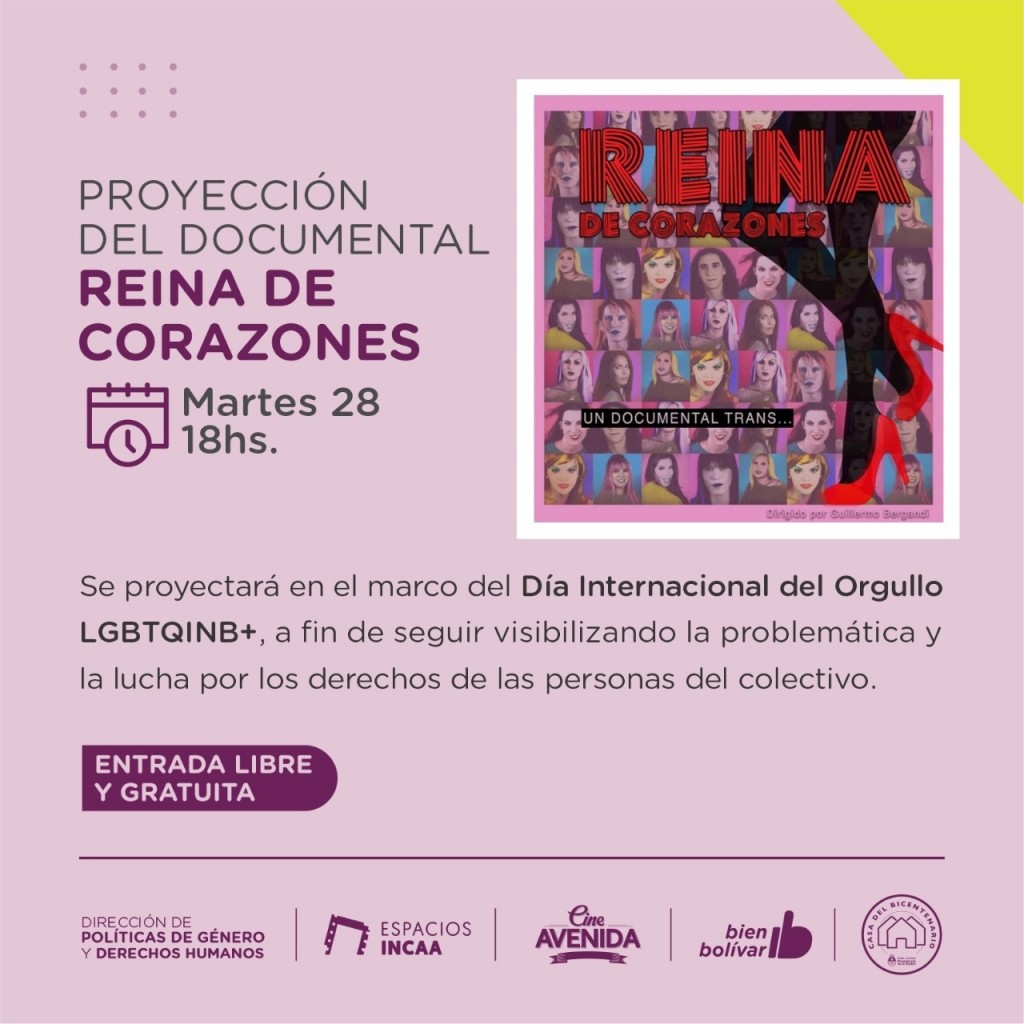 En el marco del Día Internacional del Orgullo LGBTQINB+, la Dirección de Políticas de Género y Derechos Humanos junto al Cine Avenida, proyectarán el documental "Reina de Corazones".-