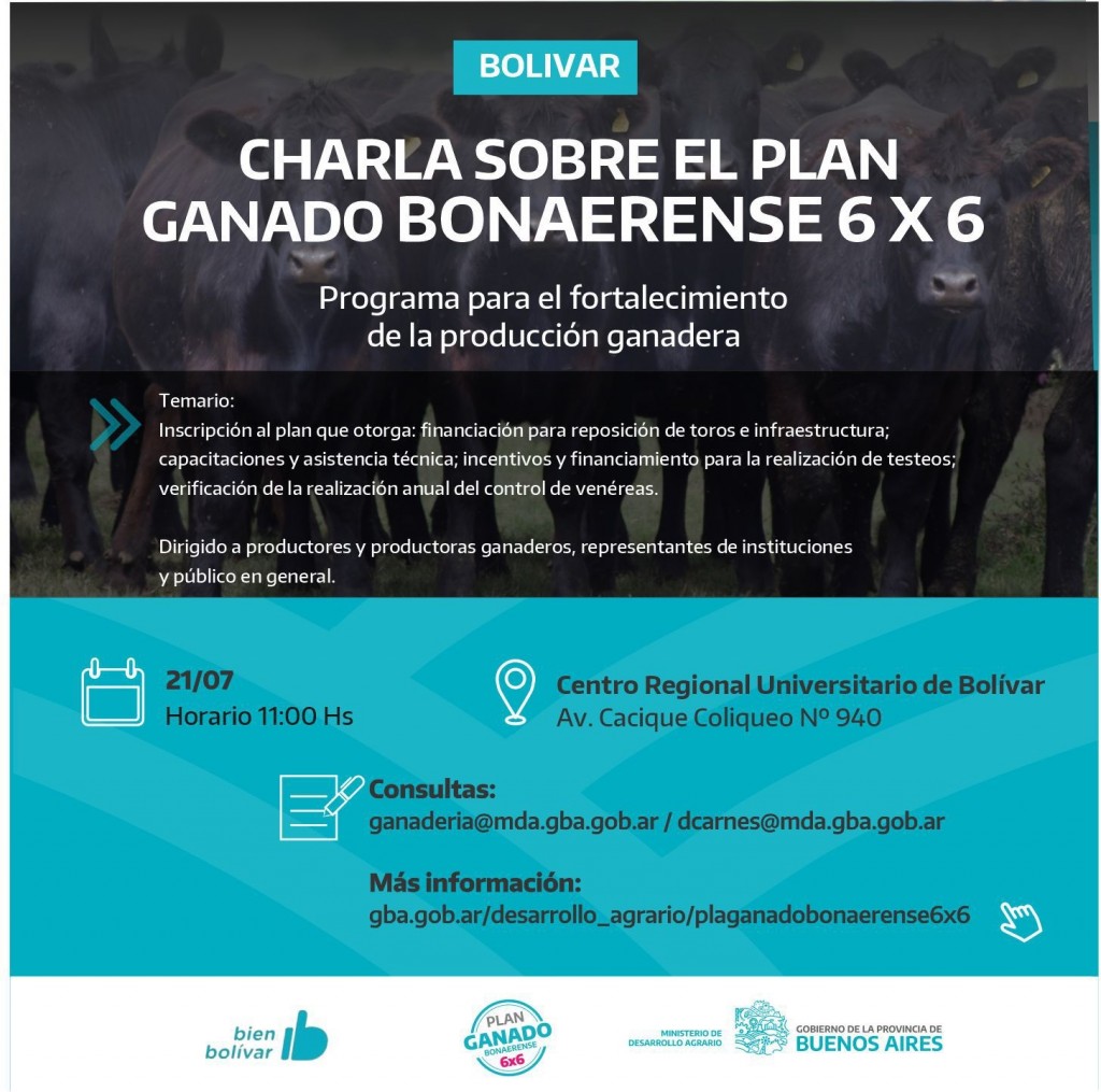 El plan tiene por objetivo mejorar la sanidad de los rodeos de la Provincia y contempla cuatro líneas: el análisis gratuito para el diagnóstico de ETS (bonificado, según la escala del stock bovino); financiamiento para la reposición de toros con diagnóstico positivo a ETS y para infraestructura ganadera; la verificación de la realización de los testeos, a partir del 15 de octubre y del 15 de mayo del año próximo según la escala del productor, y asistencia técnica y capacitaciones. Desde la Secretaría a cargo de Lorena Carona, se invita a todos/as los/as interesados a participar del encuentro que permitirá asesorarse y conocer en profundidad el programa. Quienes quieran pueden consultar más información a través de la web gba.gob.ar/desarrollo_agrario/planganadobonaerense6x6