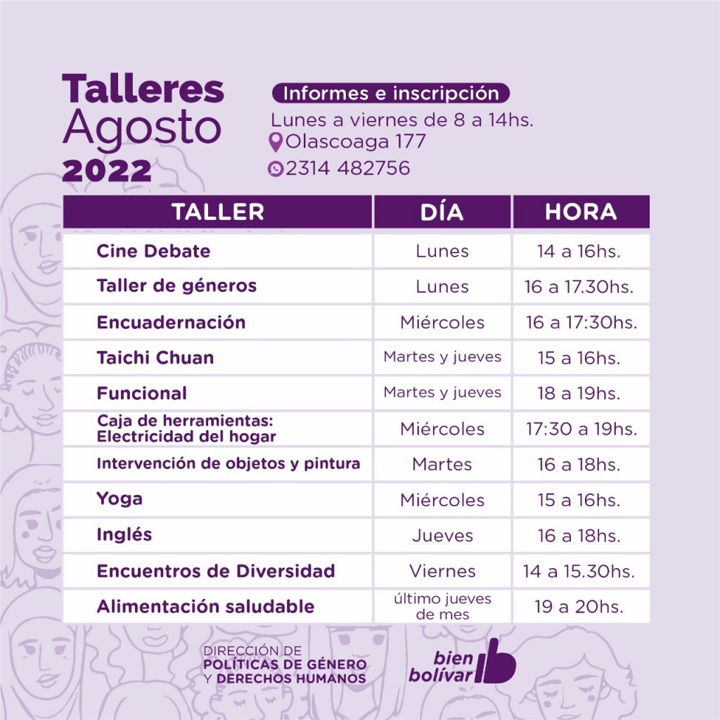 Además, habrá Funcional los martes y jueves de 18 a 19hs; Taller Caja de Herramientas: Electricidad del hogar los miércoles de 17.30 a 19hs; Intervención de Objetos y Pintura los martes de 16 a 18hs; Yoga los miércoles de 15 a 16hs; Inglés los jueves de 16 a 18hs; y Encuentros de Diversidad los viernes de 14 a 15.30hs. Asimismo, el último jueves de cada mes, de 19 a 20hs, se brindará un Taller de Alimentación Saludable.