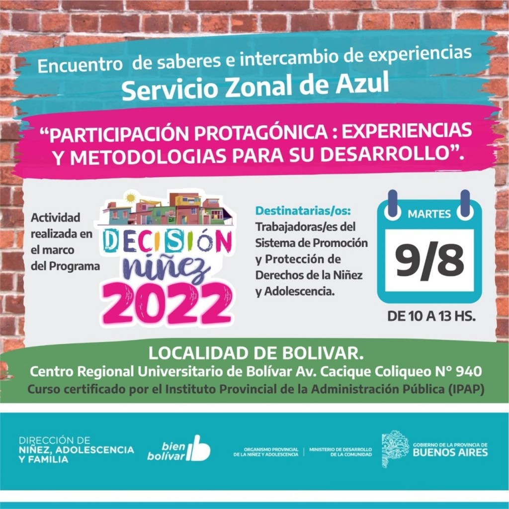 La Dirección de Niñez, Adolescencia y Familia del Municipio en conjunto con el Servicio Zonal de Azul y el Instituto Provincial de la Administración Pública (IPAC), brindarán la capacitación destinada a trabajadoras/es del Sistema de Promoción y Protección de Derechos de la Niñez y Adolescencia.