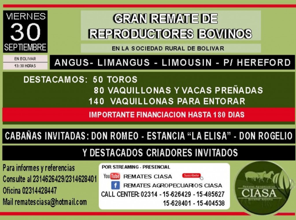 Angus, Limangus, Polled Hereford, Limousín y Braford serán las razas que se van a comercializar. “Se comienza a las 13.30 horas a martillo corrido con la venta de las hembras, pasando finalmente a los toros”, agregó.