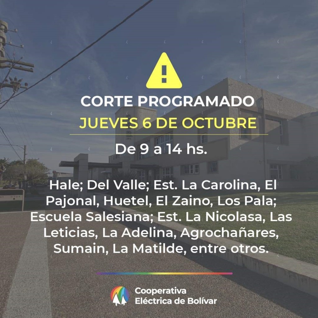 El día Jueves 6 de octubre entre las  9 y las 14 horas, se prevé corte en zona rural para reparación y mantenimiento en líneas de media tensión.