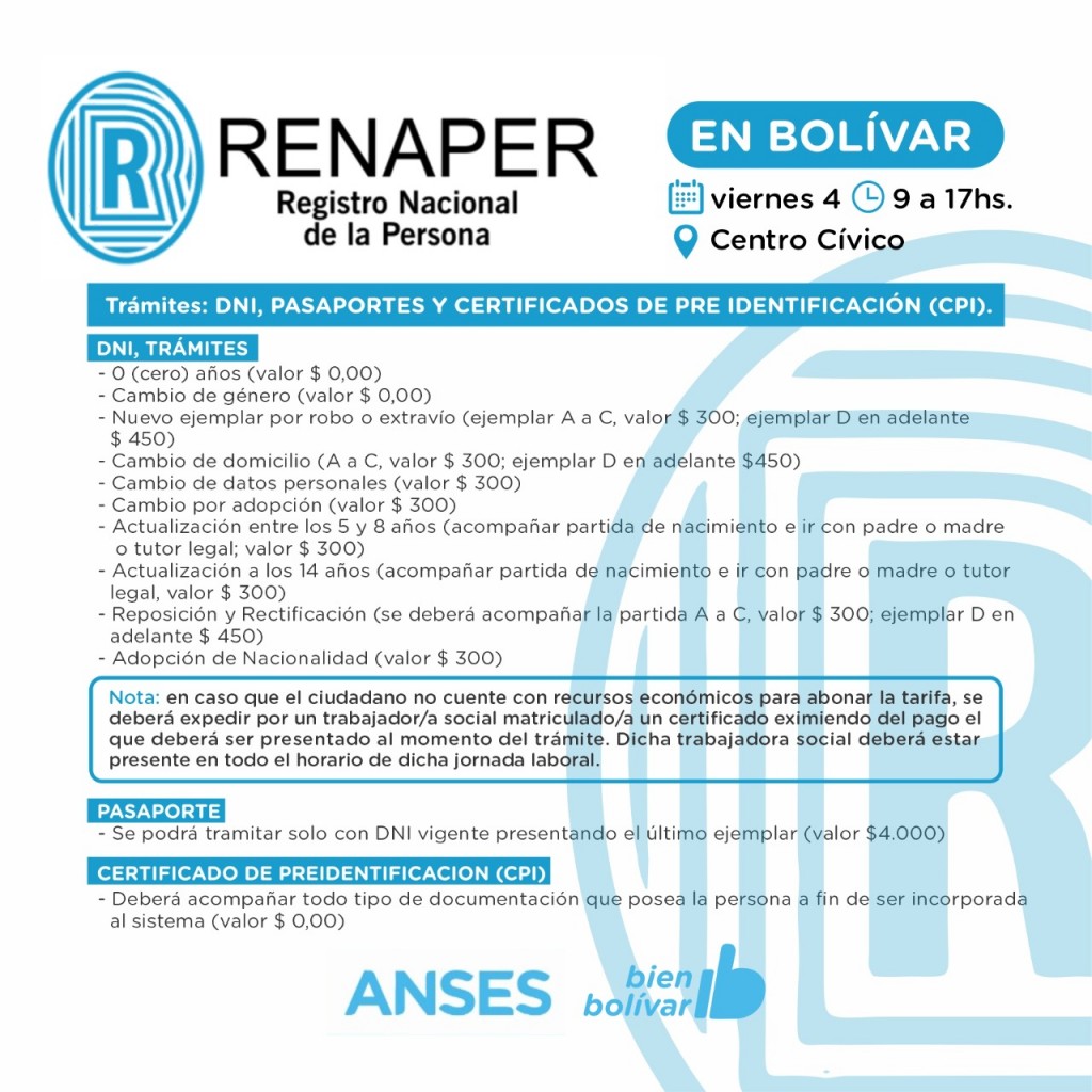 El Registro Nacional de la Persona (RENAPER) brindará atención a la comunidad este viernes 4 de 9 a 17hs, en el Centro Cívico.-