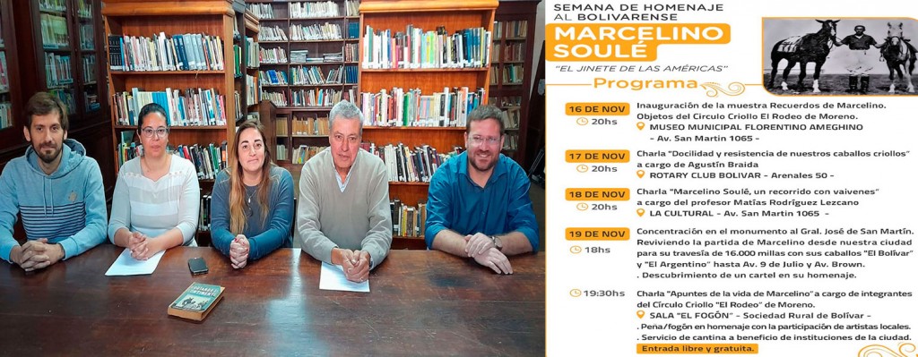 El Rotary Club, la Sociedad Rural de Bolívar, Salinas Grandes, el Museo Municipal, el Archivo Histórico Municipal y la Dirección de Turismo, organizaron actividades en el marco de la Semana Homenaje al Bolivarense Marcelino Soulé, quien se destacó por unir a Bolívar con Estados Unidos, en una cabalgata que concretó en tres años.-