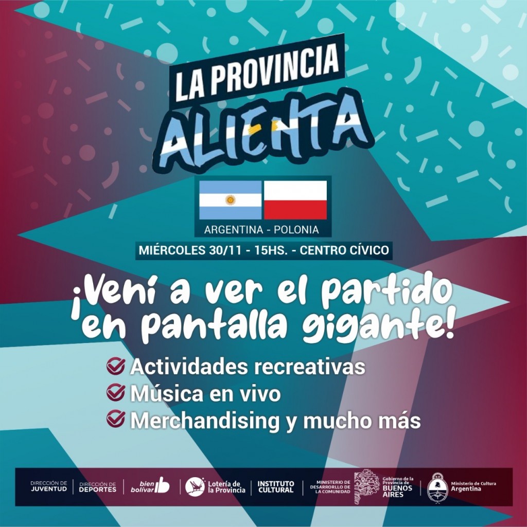“La Provincia Alienta” es una iniciativa del Ministerio de Desarrollo de la Comunidad, el Instituto Cultural, Banco Provincia y Lotería de la Provincia de Buenos Aires que ofrece espacios de encuentro en diferentes municipios para ver los partidos de la Selección Argentina durante el Mundial de Qatar.