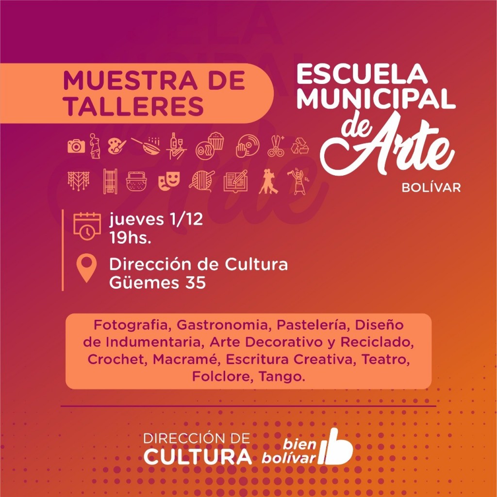 A cargo de profesores bolivarenses idóneos en cada temática, los talleres que participan de la muestra de fin de año son Fotografía, Gastronomía, Pastelería, Diseño de Indumentaria, Arte Decorativo y Reciclado, Crochet, Macramé, Escritura Creativa, Teatro, Folclore y Tango.
