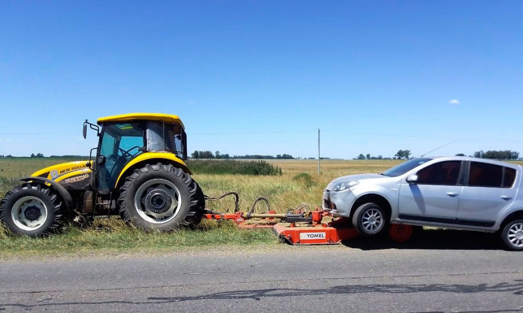 tampaCarlos Gustavo Giagomotti, conducía un Renault Sandero, con dominio colocado OSQ923, y viajaba acompañado por Antonio Orlando Espinosa. Ambos oriundos  de Colonia Seré (Partido de Carlos tejedor), y resultaron ilesos. Por otra parte, Eduardo Ordienco circulaba a bordo de un tractor con dominio colocado ECU50, remolcaba una segadora. En este caso, tampoco el conductor sufrió heridas.