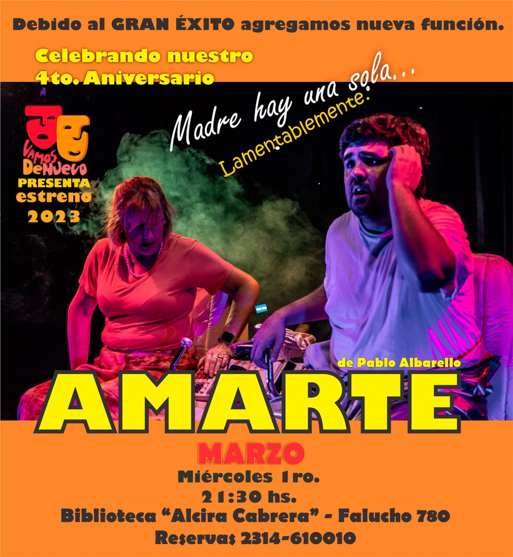 El Grupo de Teatro “Vamos de Nuevo” cumple hoy 4 años y lo celebra con una función de “Amarte” en la sala de la Biblioteca Alcira Cabrera