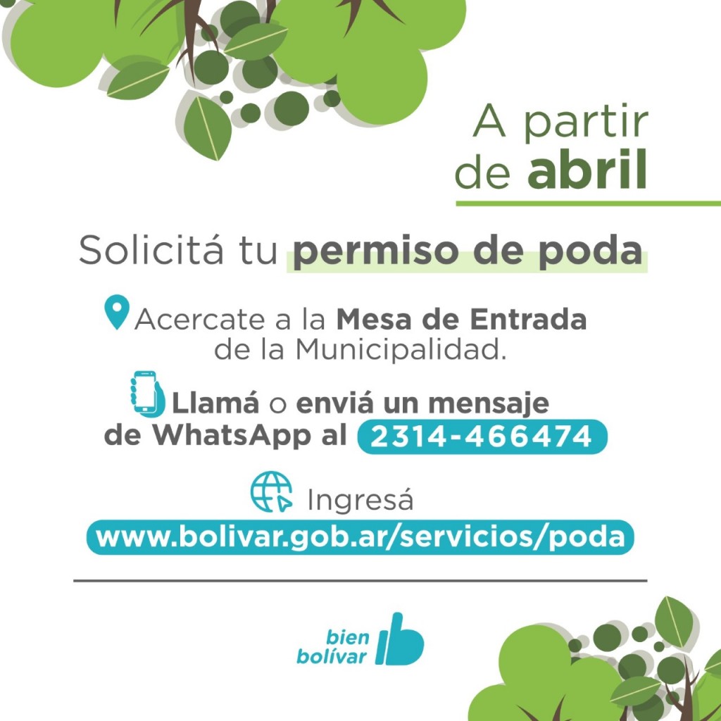Además, según establece la Ley de Arbolado Público Urbano y con la finalidad de realizar la poda uniforme del arbolado público, los vecinos de Bolívar podrán solicitar el permiso de poda en la página web www.bolivar.gob.ar/servicios/poda, acercándose a la Mesa de Entrada del Municipio, o comunicándose a través del teléfono del Programa “La Muni Cerca” 2314 - 466474.