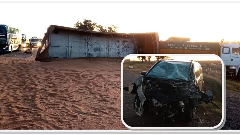 El accidente sucedió este 1 de mayo, minutos después de las 17 horas. La mujer que manejaba el auto fue trasladada al Hospital de Carlos Casares, mientras que el camionero resultó ileso. Testigos hablaban de un tercer auto involucrado que siguió su camino. La carga del acoplado, trigo quedo desparramada en la cinta asfáltica.