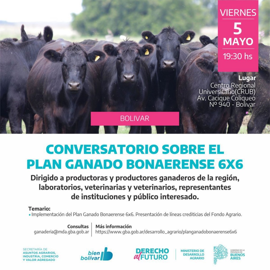 El viernes 5 de mayo a las 19.30 horas, en el CRUB, tendrá lugar una nueva charla sobre el Plan Ganado Bonaerense 6X6, una iniciativa que acompaña la Secretaría de Asuntos Agrarios del Municipio, con el objetivo de aumentar la productividad ganadera en la provincia de Buenos Aires.