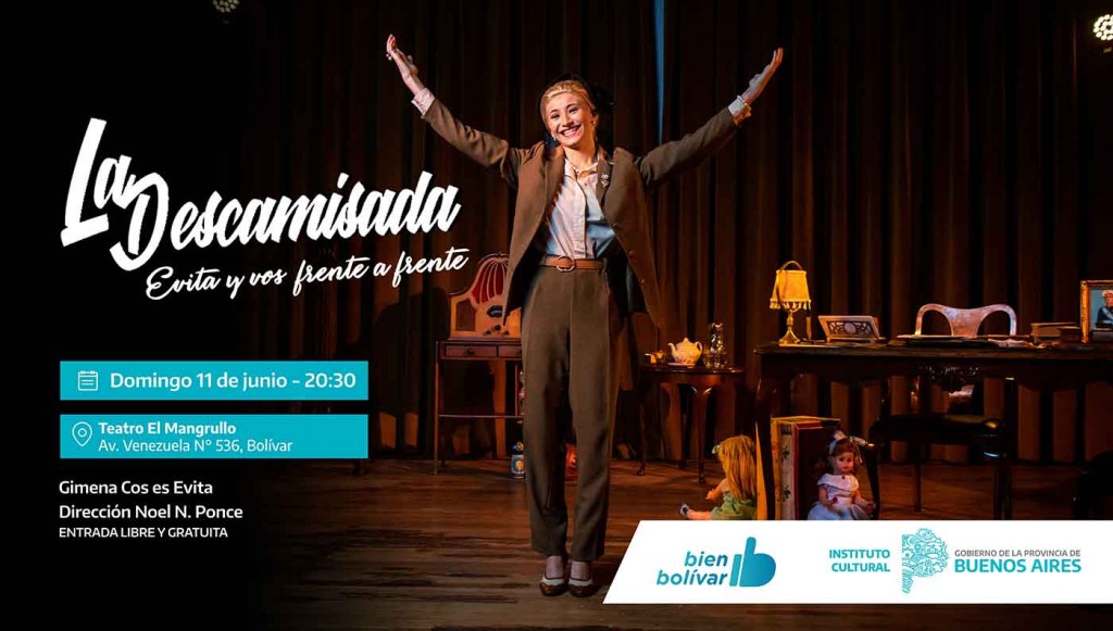El Instituto Cultural de la Provincia de Buenos Aires -en articulación con el municipio de Bolívar- presentará el domingo 10 de junio una nueva función de la obra de teatro unipersonal sobre Eva Duarte de Perón: “La Descamisada Evita y vos frente a frente”, escrita por Homero Bimbo y dirigida por Noel Nazarena Ponce. Con el rol protagónico a cargo de la protagonista Gimena Cos, la función se iniciará a las 20:30 en el Teatro “El Mangrullo” (Av. Venezuela Nº 536, Bolívar). Las entradas son libres, gratuitas y por orden de llegada.